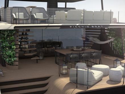 Avec le Picchio Boat, Christian Grande introduit un nouveau concept de catamaran entièrement dédié à la détente et à la dolce vita.