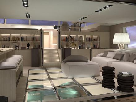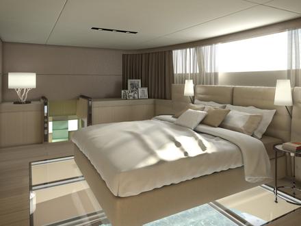 A l’intérieur, le catamaran de luxe s’articule autour d’un grand salon central et d’un bar, où l’on retrouve également l’espace repas et un vaste canapé. Particularité de cet espace de vie : une plateforme transparente en verre qui permet d’observer la mer et la vie aquatique. La nuit, le spectacle est encore plus impressionnant grâce aux spots subaquatiques qui éclairent les fonds marins. Un sol en verre que l’on retrouve également dans la plus grande des cabines du bateau. Outre la cabine propriétaire, accessible depuis le poste de pilotage, qui affiche tout le confort et le luxe dont on peut rêver sur un bateau de cette taille, le Picchio Boat abrite deux cabines VIP dotés de salles de bain privées, et une chambre pour les enfants.