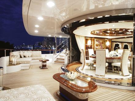 Dans sa prime jeunesse, le chantier Benetti, père et fils, a produit des trois mâts tout en bois pour un usage commercial. Mais avec le déclin de la marine marchande, le constructeur a choisi une nouvelle voie : la production de yachts de plaisance en acier qui ont progressivement gagné en taille et en luxe. En 1983, le chantier Benetti a fait son entrée dans les salles obscures grâce à Nabila, un yacht de près de 86 mètres, choisi pour le James Bond Jamais plus jamais (Say Never Again). En plus d’héberger l’ennemi juré de l’espion britannique, Nabila a connu l’honneur d’être le plus grand yacht jamais construit lorsqu’il fut mis à l’eau en 1980. Haut comme trois étages d’immeuble, ce yacht était doté de trois ascenseurs, une petite salle de cinéma, une discothèque, une piscine, deux saunas et une salle de billard. L’un de ses propriétaires, Donald Trump, avait peint un T géant sur la piste d’hélicoptère du Nabila. Le yacht est ensuite parti en Arabie Saoudite.