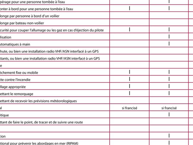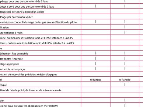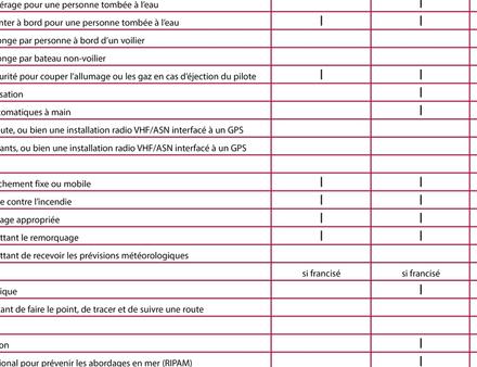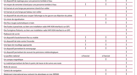 Ci-dessous le tableau concernant le matériel obligatoire à embarquer à bord.