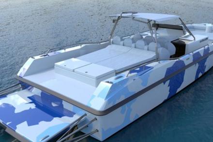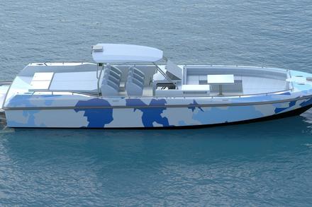 Connu pour ses yachts à moteur, Couach présentera au Festival de la Plaisance de Cannes le Hornet, un day-boat de 13 mètres ultra rapide, haut en technicité et personnalité. Un segment sur lequel on n’attendait pas le chantier, mais qui est légitime, sachant que Couach équipe les douanes et marines dans le monde entier depuis des décennies sous le nom de Plascoa. Afin de donner naissance à cette nouvelle unité, les équipes de Couach associées au designer Franck Reynaud se sont basés sur le Plascoa 1300 FIC, qui a pour vocation de protéger les côtes, et l’ont transformé en un bateau de plaisance technologique idéal pour les amateurs de sensations fortes, proposant les mêmes équipements que les bateaux militaires. La carène en « V » profond permet au bateau d’afficher un comportement marin hors du commun même à de très hautes vitesses. Négociant parfaitement les courbes sans gîter, le Hornet peut monter à plus de 50 nœuds sans taper sur la vague. Sur le plan esthétique, l’équipe de design a joué jusqu’au bout la carte du « military boat », avec un parti-pris résolument technologique pour un bateau très sécuritaire. A la différence du 1300 FIC qui affiche une cabine en composites, le Hornet est doté d’un hard-top tubulaire en inox micro-billé qui lui confère un rendu très technologique. Un style renforcé par des détails tels que des soudures apparentes non polies. Autre effet de style : le bain de soleil arrière montré sur un ensemble tubulaire inox, qui tranche avec les habituels bains de soleil en composites.