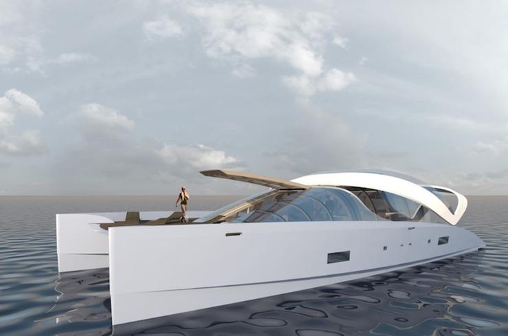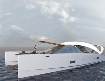 L'Air 77, qui sera présenté en première mondiale au Festival de la Plaisance de Cannes en septembre prochain, évoque à la fois une bulle posée sur l'eau et un coquillage. Le design de ce catamaran à la silhouette futuriste est signé Frédéric Sarfati, qui s'est s'affranchi des codes un peu figés des productions habituelles. La démarche n'est pas sans rappeler le catamaran « Bradley » conçu par le chantier français H2X il y a quelques années, mais le bateau est esthétiquement plus abouti. Créer une unité aux dimensions très généreuses qui s'intègre dans son environnement n'était pas un défi gagné d'avance mais ce bel objet de 23 mètres de long sur plus de 10 de large semble y parvenir. Il offre 280 m2 d'espace de vie, avec un impressionnant open space central de 65 m2, digne d'un appartement ultra-moderne. Le roof transparent permet une vision panoramique à 360 degrés et le plan de pont a été imaginé pour des déplacements naturels et fluides. Aucun obstacle n'interrompt la promenade de la proue à la poupe, l'espace avant est une magnifique terrasse en teck ouverte sur la mer et l'arrière ressemble à un loft hi-tech. On trouve à bord quatre cabines, chacune dotée de son propre cabinet de toilette avec douche. L'heureux skipper dispose de deux postes de pilotage, un sous le roof, l'autre sur le fly bridge, lui-même aménagé en salon-bain de soleil.