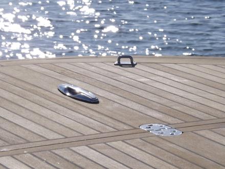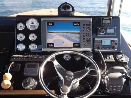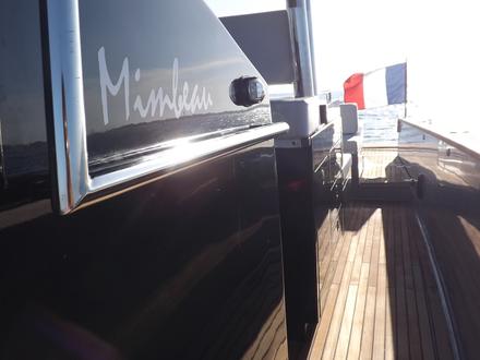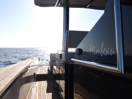 À bord, le pont entièrement latté en teck, la très belle sellerie ainsi que la qualité de la finition, aboutissent à une ambiance luxueuse mais on appréciera le style très minimaliste. Six personnes peuvent s'assoir autour de la table du carré central, le bain de soleil avant est immense et la partie arrière, totalement ouverte grâce à la motorisation inboard, permet de bénéficier d'un accès sans entrave vers la mer et la plage de bain. On s'imagine déjà allongé à l'arrière. Si les passagers bénéficient d'un environnement privilégié, le pilote n'est pas à plaindre. Confortablement assis devant une console de pilotage au look high-tech, il dispose de 380 ch. Le Mimbeau revendique 36 nœuds en pointe et une vitesse de croisière de 25 nœuds permettant d'avaler les miles en toute sérénité.
