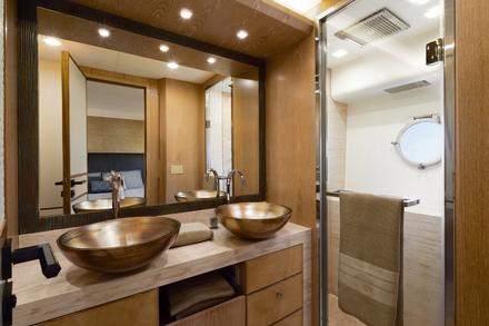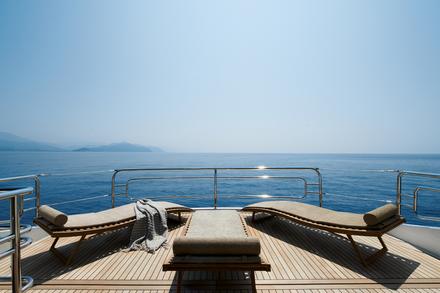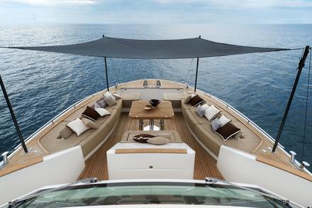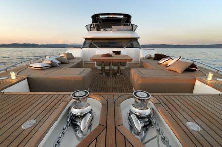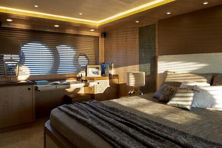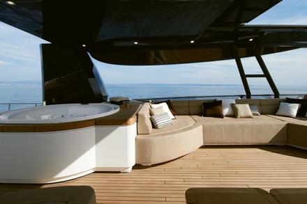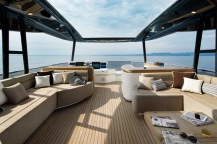Avant d’arriver à Cannes, le bateau a été dévoilé à un cercle restreint de potentiels clients cet été. Il est arrivé de nuit, sous la pleine lune. Au cours d’un ballet bien orchestré, le nouveau-venu a pris le temps de tourner sur lui-même pour faire briller sa robe scintillée, réalisée avec de la peinture automobile. Pas de doute, le Monte Carlo Yacht 86, est bien le prolongement de la famille déjà composée du 76 et du 70 pieds. « Le nouveau venu est le grand frère des premiers modèles mais il sera probablement au milieu d’une gamme plus élargie dans le futur », précise le designer Dan Lenard. « Il faut donc y penser et ne pas créer une ligne trop agressive car cela nous mettrait en difficulté pour la suite. » Le Monte Carlo Yacht 86 est donc très classique avec des finitions soignées. Il faut dire que Carla Demaria, la virevoltante patronne italienne de Monte Carlo Yacht, tient à tenir le cap. « Nous devons tout le temps évoluer dans un monde d’incertitude, les changements sont plus rapides et nécessitent plus d’attention, analyse-t-elle. Et à force de s’adapter on pourrait risquer de perdre notre direction. Mais même si notre histoire est courte, nous sommes dans un groupe de 130 ans (Bénéteau, ndlr) qui nous aide à conserver la même constance. » L’idée reste d’utiliser l’ADN des superyachts, que Dan Lenard et Carlo Nuvolari créent tout au long de l’année, pour l’injecter dans des formats plus modestes. Le mât, typique des formats plus grands, est ainsi le pilier de la série Monte Carlo Yacht. « L’idée c’est de s’appuyer sur des éléments fonctionnels pour en faire des ingrédients stylistiques », précise Dan Lenard. Le designer a conçu dans la même année un 86 pieds et un 86 mètres et il avoue d’emblée que le plus petit modèle n’est pas le plus facile. L’agencement a ainsi été longuement pensé pour donner la même impression d’espace que dans les superyachts. Il dispose donc de larges espaces extérieurs, pouvant même accueillir un jacuzzi, et d’un espace séparé à l’intérieur pour l’équipage. Ce nouveau yacht de 86 pieds est disponible avec des tissus Hermès ou Armani.