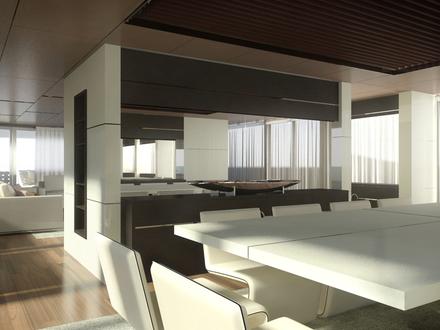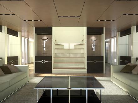 Lumineux et luxueux, le bateau affiche des lignes harmonieuses et une vue panoramique sur la mer. A l’extérieur, il propose plusieurs espaces de détente dont une terrasse, dotée d’un bar et d’une douche, mais également des espaces dégagés permettant une circulation fluide sur le bateau. Le pont avant a quant à lui été pensé de manière différente et ne ressemble pas à ceux que l’on a l’habitude de retrouver sur les yachts traditionnels. Entièrement dégagé, il se transforme aisément en espace de détente où propriétaire et invités peuvent se retrouver autour du bain à remous idéalement située à l’abri des regards. A l’intérieur, une grande attention a été portée aux détails mais également au design. Le contraste de couleurs et de matériaux couplé à la grande luminosité conférée par les larges ouvertures latérales vient d’ailleurs renforcer le côte luxueux du bateau mais également la luminosité intérieure.