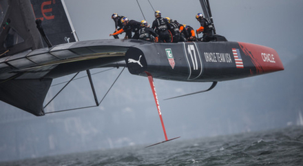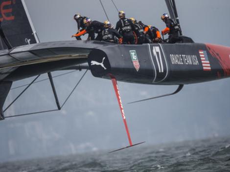 La course 4 s'élance de la même manière que la précédente : l'Australien James Spithill lance son bolide de carbone mieux que son homologue néo-zélandais. De la première marque à quelques mètres de la porte sous le vent, la copie des Américains est parfaite mais une erreur de foil (dérive courbée) fit tomber le bateau de ses échasses, réduisant l'écart qu'ils avaient réussi à créer sur ETNZ. Mais, à la surprise générale, les Américains mènent encore à la bouée au vent alors que l'AC72 des Néo-Zélandais semblait plus rapide au cours des trois premières manches courues.