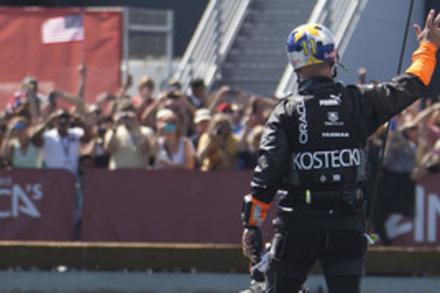 À voir Grant Dalton suer, on comprend l'effort physique démentiel que demande les réglages des AC72. Un mano à mano magnifique se tient alors, après qu'Emirates Team New Zealand ait réduit l'écart latéral avec Oracle Team USA sur un long bord tribord amure. Les deux catamarans offrent un duel serré, se cherchent mutuellement et n'ont aucune crainte à "aller au contact" sans se toucher. En combat rapproché - les deux bateaux ont été à moins de 10 mètres les uns des autres - il faut reconnaître que le chevalier noir Dean Barker et son groupe de 10 All Black possèdent un avantage de vitesse non négligeable sur les Américains de James Spithill. C'est ainsi que les Kiwis passèrent la marque au vent devant un defender impuissant relégué à 28 secondes sur la ligne d'arrivée. À ce moment là il est difficile de penser qu'une victoire américaine approche.