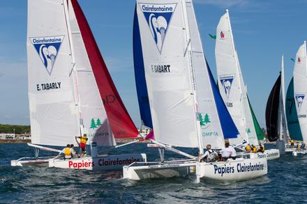 Qui dit rentrée des classes dit Trophée Clairefontaine. Cette année encore, huit champions et leurs équipiers se sont donnés rendez-vous ce week-end à La Grande-Motte à l’occasion de la 24e édition du Trophée Clairefontaine des champions de voile, un événement organisé par SailingOne et soutenu par le Groupe Exacompta Clairefontaine. Et comme à chaque édition, le plateau était relevé. Cette année, François Gabart donc, Nicolas Charbonnier, Fred Le Peutrec, Erwan Tabarly, Michel Desjoyeaux, Bertrand Pacé, Yann Eliès et Armel Le Cléac’h étaient venus accompagnés d’équipiers de choix pour un week-end de régates à bord de catamarans monotypes. Et c’est finalement François Gabart, déjà leader au classement général hier soir, qui s’en est le mieux tiré, dominant nettement Nicolas Charbonnier, vainqueur en 2011 et 2012 et Fred Le Peutrec, qui doit se contenter de la troisième place. Erwan Tabarly, invité pour la première fois au Trophée Clairefontaine pour sa victoire sur la Transat Bretagne-Martinique, échoue au pied du podium. Vainqueur du premier run de ce dimanche, Michel Desjoyeaux, grand habitué du Trophée Clairefontaine, termine quant à lui cinquième. Handicapé par un chavirage pour par un démâtage entre deux régates, il a du jeter l’éponge avant la fin de la dernière journée de compétition. Une dernière journée qui s’est jouée dans une solide brise, tranchant avec le vent léger de la veille.