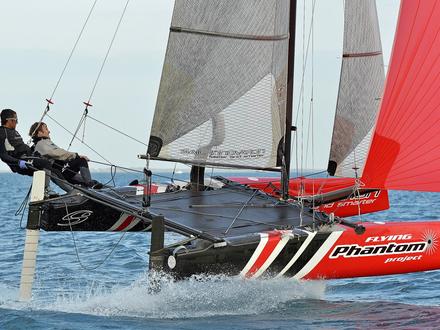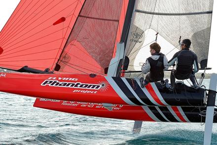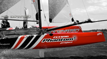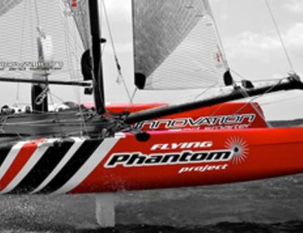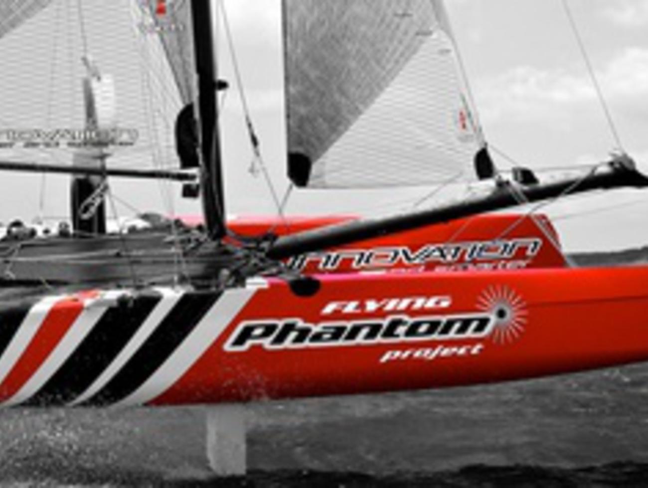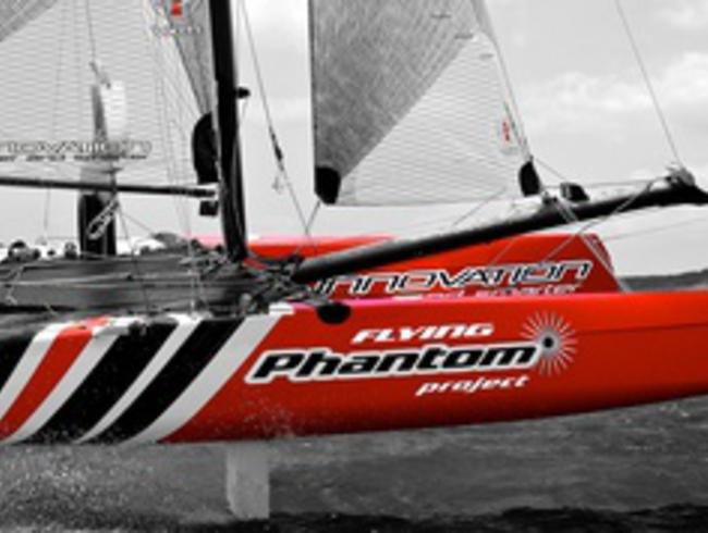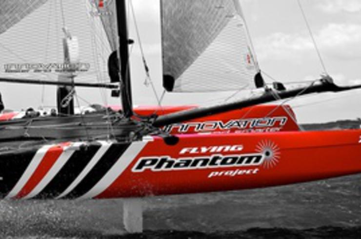 Lancé par Alex Udin, fondateur de la société Sail Innovation, le projet Phantom avait pour objectif principal de développer un catamaran volant One Design pour le grand public. « À cette époque, Emirates Team New Zealand et les autres AC72 ne volaient pas encore, mais nous étions convaincus avec Martin Fischer que c’était l’avenir. Afin d’amortir les moules et sachant que le développement allait être long, nous avons décliné une version du F18 à partir des mêmes formes de coques, le Phantom F18, qui a remporté des championnats du monde et d’Europe l’année dernière, et termine vice-champion d’Europe cette année, nous explique Alex Udin. Je pense que dans l’histoire des petits catamarans de sport, les 18’, dont notamment les F18 ou les Classe A, sont ceux qui ont probablement remporté le plus de succès au cours de dix dernières années ». En effet, cette taille permet d’avoir des bateaux plus marins qu’un 16’ et moins physiques et onéreux que les 20’, le plus souvent réservés à des équipages assez lourds. Si Alex Udin a confié le design du Flying Phantom à Martin Fischer, ce n’est pas par hasard. « Nous avons monté il y a quatre ans une équipe de coureurs pour faire du F18, composée des ex-tornadistes Olivier Backes et Arnaud Jargelan, poursuit Alex Udin. Notre objectif était de remporter les championnats du monde. Nous avons lancé un programme de développement intensif sur les voiles d’un Capricorn, premier F18 dessiné par Martin. Il nous a alors contactés car il était intéressé par notre démarche de développement et souhaitait nous aider. En 2010 nous avons décidé de naviguer une saison avec un Hobie Wild Cat que Martin avait dessiné, avec lequel nous avons remporté les championnats du monde à Erquy. À la suite de cela, nous avons décidé de monter ensemble le projet Phantom, qui était la suite logique de notre programme de développement ».