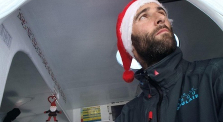 Lors du précédent Noël, sur le Vendée Globe 2012-2013, les marins ont également tenu à conserver une part de magie. C’est le moment d’ouvrir les cadeaux dissimulés en douce par la famille avant le départ et d’améliorer le menu du bord, avec du chocolat, voire un quart de champagne. Puis de se filmer avec un bonnet de père Noël sur la tête. Mais en course en solitaire, il n'est pas toujours possible de le fêter le jour J. Jean Le Cam, skipper de Synerciel, s'est ainsi offert un bon repas avec du ris de veau le… 23 décembre : « C’était ma dernière opportunité avant que le vent ne monte trop » a-t-il expliqué. D'autre part, les marins étant dispersés de part et d'autre de l'antiméridien, ils n'ont pas tous fêté Noël au même moment. Comme les concurrents du Vendée Globe, Bernard Moitessier naviguait également dans les mers du sud pour Noël, lors de sa première course en solitaire autour du monde. Mais il navigue alors sur une mer plate et sans un souffle de vent. Il raconte dans la Longue Route qu’il s’imagine arriver en Nouvelle-Zélande où il croiserait un yacht et inviterait ses occupants à venir partagerchampagne et vins français à bord de Joshua. « On se raconte des petites histoires quand on est seul en mer », écrit-il. Mais le naturel philosophique du navigateur reprend vite le dessus : « Il y a une grande paix tout autour. Je passerai le réveillon bien tranquille en compagnie des étoiles. »