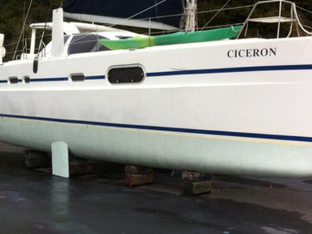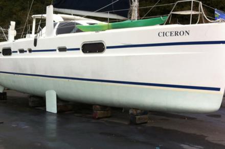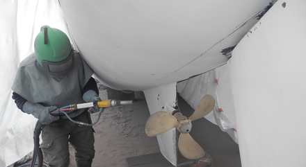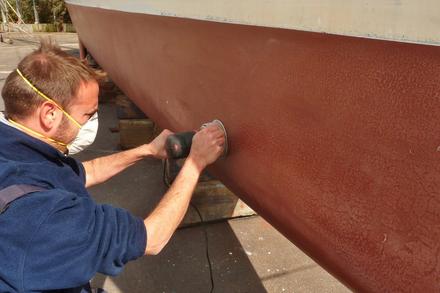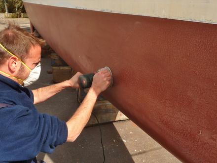 Nous avons suivi sur un Catana 52, l’application du M300 par la société BioNautique. Il est composé en majorité de particules de cuivre pur encapsulées dans une résine polyester hybride. Il se compose de résine, de cuivre et de durcisseur. Les proportions sont pour 1 kg de résine, 1,25 kg de poudre de cuivre et 20 g de durcisseur. Pour une efficacité optimale, la carène doit être parfaitement propre, l’idéal est d’ôter toutes les anciennes couches d’antifouling soit par hydrogommage soit par aérogommage. Ensuite, il faut passer un primaire époxy bi-composant et effectuer un léger ponçage d’accroche (grain 120). Le M300 peut-être appliqué en une seule couche au rouleau ou au pistolet. Après séchage (compter 12 heures), la carène doit être poncée pour activer l’antifouling. Ce produit n’est pas érodable, il nécessite, suivant les zones et le temps passé au mouillage, d’effectuer un simple nettoyage 2 à 3 fois par an qui peut se faire en plongée avec une éponge.