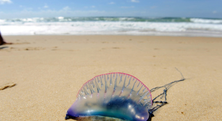 Attention, danger. La physalie traîne derrière elle ses tentacules très urticants, longs parfois de plusieurs dizaines de mètres. Sa piqûre inflige surtout de sérieuses lésions cutanées, mais elle peut être mortelle (la douleur est si vive que le cœur peut lâcher). Rarement amenée jusqu’à nos côtes par le Gulf Stream (son signalement en Atlantique et en Manche est surtout le fait d’échouages accidentels), elle préfère les eaux chaudes de Floride, des Bahamas ou des Caraïbes. De 10 à 20 cm, son flotteur violacé se trouve au-dessus de la surface : gonflé, il sert de voile, dégonflé, elle plonge complètement.