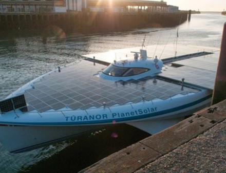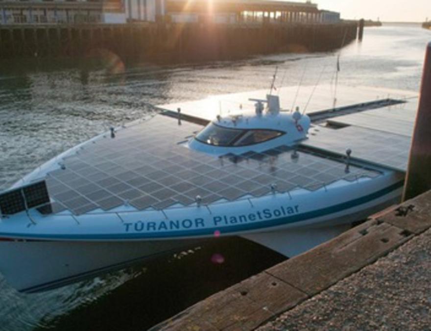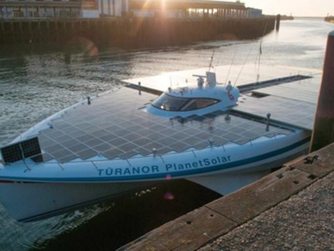 PlanetSolar, dont le capitaine est le navigateur français Gérard d'Aboville, est équipé de 825 modules avec 38.000 cellules photovoltaïques réparties sur une surface totale de 537 mètres carrés. Il atteint en moyenne une vitesse de 7,5 noeuds (14 km/h).