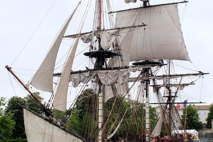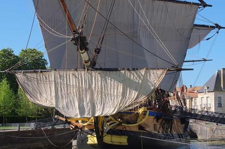 Construite dans l’arsenal de Rochefort en 1778, non loin de la Corderie Royale, l’Hermione faisait partie, avec la Courageuse, la Concorde et la Fée, d’une série de quatre frégates. Appartenant à la catégorie de frégates dites légères, caractérisées par leur vitesse et leur maniabilité, l’Hermione était équipée de 26 canons tirant des boulets de 12 livres, d’où son nom de « frégate de 12 ». Longue de 44,20 mètres pour plus de 11 mètres de large, le navire original a mobilisé pour sa construction des centaines de charpentiers, forgerons, perceurs, cloueurs, calfats et bagnards pendant 11 mois. « L’Hermione est un bateau de guerre construit sur ordre du Roi Louis XVI en quelques mois. C’est sur cette frégate que La Fayette a embarqué pour apporter son soutien aux partisans de l’indépendance des colonies anglaises en Amérique du Nord », nous explique Isabelle Georget, chargée de mission au sein de l’association Hermione Lafayette. Le Marquis de La Fayette, qui s’était porté volontaire au service de la cause américaine, s’efforce d’obtenir le soutien officiel de la France et réussit à convaincre le roi Louis XVI et son état-major d’apporter une aide militaire aux troupes du Général Washington. Il embarque le 21 mars 1780 à bord de l’Hermione et part combattre aux côtés des insurgés américains qui luttent pour leur indépendance. Après 38 jours de traversée, il débarque à Boston et rejoint le Général Washington pour lui annoncer l’arrivée imminente de renforts français. « L’Hermione a fait toute la guerre d’Indépendance et a eu une destinée assez glorieuse. C’est d’ailleurs à son bord que s’est réuni le jeune congrès américain en mai 1781 », rappelle Isabelle Georget. De retour en Europe, la frégate sombre dans un naufrage au large du Croisic en 1793. « C’était un naufrage assez bête lié à une erreur de pilotage », précise-t-elle.
