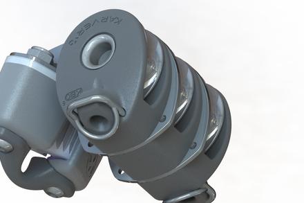 La KBO6J est une poulie triple avec bloqueur intégré et transfilée par le centre (comme toutes les poulies Karver). Les avantages sont : la sécurité (la rupture du transfilage est bien plus élevée que la poulie), le poids (minimum 345 gr), l’ajustement de l’angle du bloqueur par rapport à la poulie et la charge de travail (700 Kg). Prix 280 €.