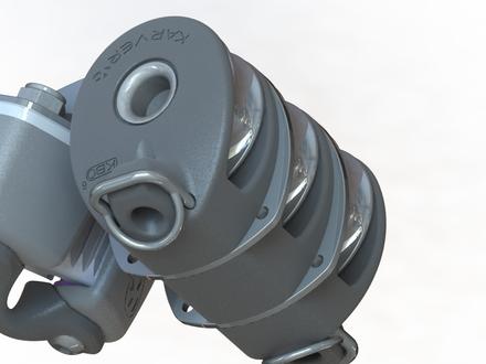 La KBO6J est une poulie triple avec bloqueur intégré et transfilée par le centre (comme toutes les poulies Karver). Les avantages sont : la sécurité (la rupture du transfilage est bien plus élevée que la poulie), le poids (minimum 345 gr), l’ajustement de l’angle du bloqueur par rapport à la poulie et la charge de travail (700 Kg). Prix 280 €.