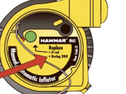 Il n’existe pas de réglementation pour la révision des gilets. L’utilisateur doit donc vérifier régulièrement l’ensemble du gilet et le système de gonflement. En premier, il faut s’assurer que la bouteille de gaz est pleine, ne présente pas de trace de rouille et est bien vissée. Pour les modèles équipés de pastille de sel cette dernière doit être propre et complète. S’il manque du sel ou s’il se désagrège, il faut la changer. Pour les systèmes hydrostatiques, en principe, il y a une date de péremption. Sur les gilets équipés d’une tête automatique Pro-Sensor (Plastimo) un témoin de fonctionnement (vert ou rouge) permet de visualiser facilement si la tête est opérationnelle (vert) ou si la bouteille est percée, dévissée ou partiellement vide (rouge). Les fabricants recommandent une révision en usine ou simplement faite par un agent agréé tous les deux ans. Celui-ci doit regarder l’état général du gilet, gonfler manuellement (sans utiliser la bouteille de gaz) la chambre, s’assurer de son étanchéité et vérifier le système de gonflage (bouteille, tête de percussion, pastille de sel ou hydrostatique). Des points que tout plaisancier doit pouvoir effectuer lui-même. Le seul point délicat est la bouteille de gaz. Si elle ne présente aucun signe extérieur d’usure par exemple de la rouille, il est bien de la peser avec précision pour vérifier la présence de gaz : pour une 100 N le poids est de 24 g, pour 150 N de 33 g et pour 275 N de 60 g. A titre indicatif, une tête de percussion hydrostatique Hammar doit être remplacée tous les 4 à 5 ans. Une tête à pastille de sel est plus sensible. Si le gilet est entreposé dans un endroit sec, ce qui est recommandé, elle n’a pas de raison de se désagréger. S’il est dans un endroit humide, là, il y a risque de désagrègement partiel du sel, ce qui entraine bien souvent de la corrosion au niveau de la bouteille. Si c’est le cas, il faut la remplacer.