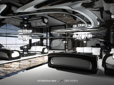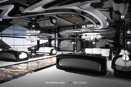 À l’intérieur, le spectacle est tout aussi impressionnant avec son immense salle d’exposition flottante, aménagée dans un style art nouveau, éclairée par de grands lustres Baccarat, équipée d’un piano Steinway et d’un double escalier Cornish permettant l’accès à l’étage supérieur. Cette grande pièce, qui sert également de salle de réception, est modulable et se convertit en pièces réduites pour des ambiances plus intimes, ou même en un luxueux garage pouvant abriter environ huit à dix sportives et cabriolets. Quant à la salle des machines, elle est située derrière de grandes parois vitrées. Les moteurs sont bien visibles, permettant un accès facile pour l'entretien et, bien sûr, pour le plus grand plaisir des passionnés d'ingénierie.