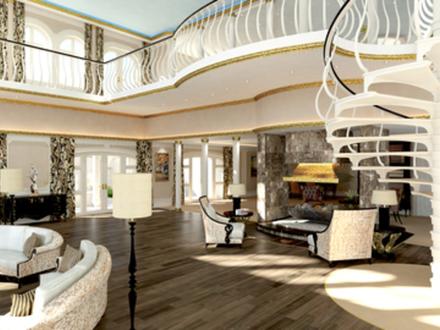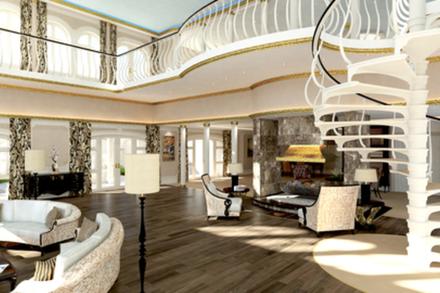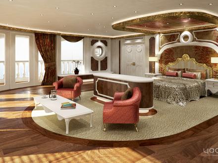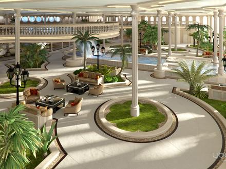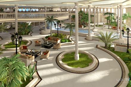 Au centre de cet espace se trouve un grand escalier en colimaçon qui mène à un café-bar à l'étage supérieur. Le rez-de-chaussée du Grand Atrium héberge sept grandes suites luxueuses allant de 135 m2 à 365 m2 (suites VIP). Ces suites disposent d’une salle de réception, salle de bains, dressing, chambre à coucher et balcon. Les suites VIP possèdent en plus un bureau. Au même étage, on trouve une bibliothèque, un bureau commun, un cinéma et une grande terrasse. Le Grand Atrium compte également une cave à cigares, une cave à vins, une salle à manger, un casino et une discothèque. À l’autre bout, se situe l’appartement du propriétaire, accessible depuis tous les ponts par un ascenseur privé. Réparti sur trois étages, il couvre une superficie de 1460 m2, et possède une double hauteur sous plafond, un salon avec cheminée, un bureau, une chambre, une salle de bains, un dressing, mais aussi une salle de musique, une cour privée, une véranda et de nombreux balcons et terrasses privés avec jacuzzi et piscine.