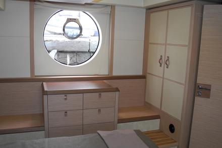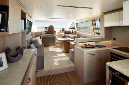 Tout d’abord, on est séduit par les larges surfaces vitrées qui donnent une luminosité extrême et une vue sur la mer. Ensuite, nous trouvons dès l’entrée un meuble bas de rangement au-dessus duquel des niches encastrées peuvent servir de bibliothèque. Des détails peut-être mais qui ont l’avantage de ne pas casser le volume. A tribord, se situe la cuisine bien conçue, avec un plan de travail en Corian Bone, deux réfrigérateurs tiroirs de 75 litres, une plaque induction 3 feux, hotte et four. Seul point négatif, elle est peu éclairée naturellement. Passons à la partie repos. Nous avons un escalier de bonnes dimensions qui arrive sur une coursive centrale. Cette dernière dessert les trois cabines. Il faut s’arrêter sur la cabine propriétaire avec un grand lit (1.95/1.58 m), des penderies volumineuses, une salle de bain originale avec WC et douche indépendante et accès séparés dans la cabine. Quant à l’éclairage naturel, il se fait par deux hublots de coque panoramiques avec hublots ouvrants. Les deux cabines réservées aux invités ne sont pas en reste avec quatre hublots ouvrants sur les côtés mais également salle de bain avec douche séparée. En option, une cabine de marin dont l’accès se fait par la plateforme de bain du cockpit. Cette version trois cabines est la version standard pour la clientèle européenne. Celle-ci peut être agrémentée par différentes options. La liste est longue pas moins de 30 pour l’extérieur et 20 pour l’intérieur. Parmi elles, nous pouvons citer une cave à vin, une machine à laver avec séchoir ou encore une centrale aspirateur.