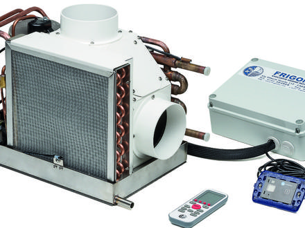 Les climatiseurs monobloc Frigomar (Kent Marine) sont conçus pour être installés sur les bateaux qui disposent de peu de place ou dans les cabines de taille réduite. Ils sont équipés d’un ventilateur avec 3 sorties d’air : verticale, horizontale et orientée à 45°. Il est possible d’utiliser une, deux ou trois sorties en fonction de la puissance désirée ou des contraintes d’installation. Chaque monobloc est livré avec son coffret électrique déportable, son thermostat, son récepteur I/R avec 6 m de câble et sa télécommande I/R.
