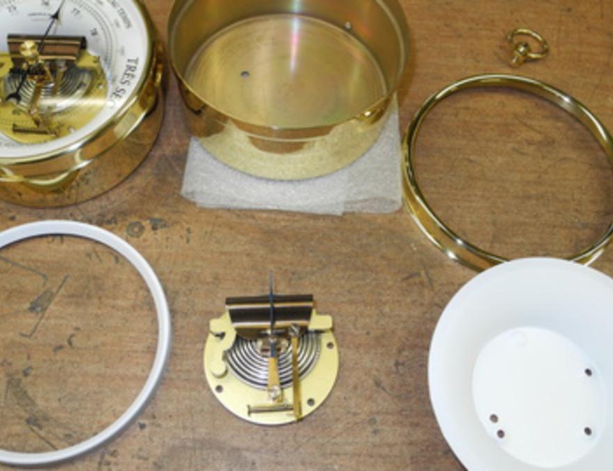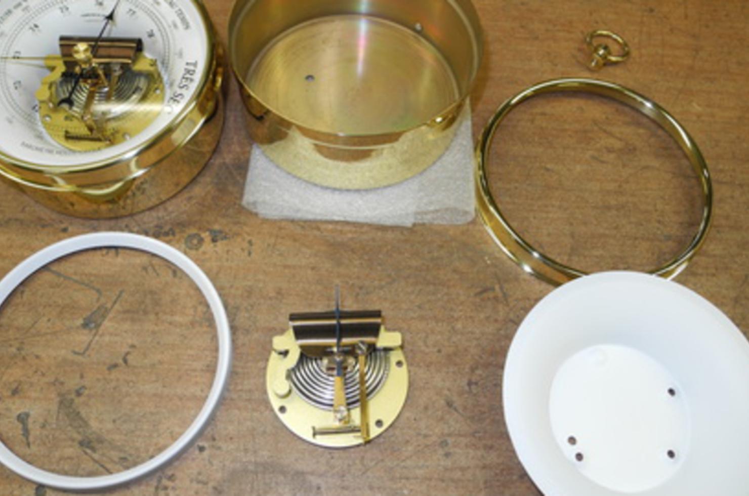 Pour fabriquer un baromètre, Naudet réalise en premier la partie mécanique. Tout part d’une plaque de laiton qui est découpée, emboutie, façonnée pour obtenir le boitier brut. Le polissage est effectué chez un sous-traitant français. Au retour, le boitier est verni à chaud pour garantir une meilleure protection contre la corrosion et donner ce bel aspect brillant. La capsule anéroïde, le cœur du baromètre, est réalisée et soudée manuellement puis assemblée avec les différentes pièces du mouvement (30 à 50). L’étalonnage par rapport à une colonne de mercure sera la dernière étape de fabrication.