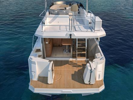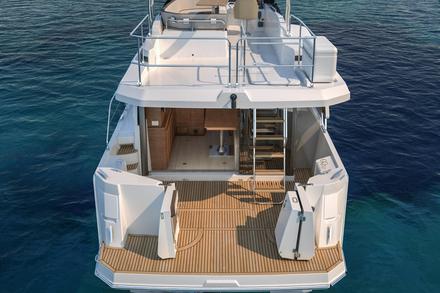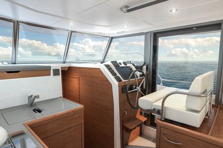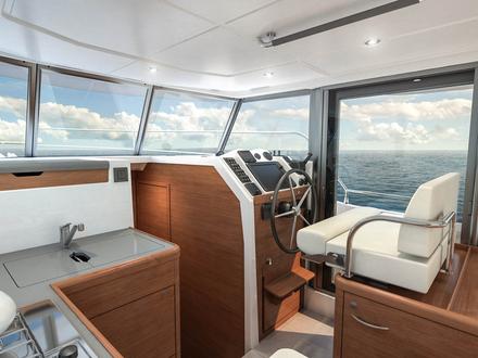 Il se veut avant tout confortable, avec de grands espaces intérieurs et un maximum de puissance pour naviguer en toute sécurité. Pour cela, la carène retenue est semi-planante tulipée et, pour la motorisation, un monomoteur Cummins de 425 CV. Pour la sécurité, on trouve de larges passavants, de nombreuses mains courantes et une hauteur de balcon supérieure aux normes en vigueur. Dans la timonerie, pour le confort du pilote, la vision est sur 360°. Pour ne pas casser la ligne, le flybridge peut recevoir au choix un bimini ou un soft top.
