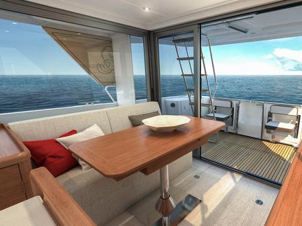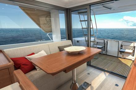 Les intérieurs conjuguent des boiseries teck et des selleries aisées à entretenir. Pour faciliter la circulation, l’accès à la cabine propriétaire se fait par une porte papillon. La seconde cabine double avec lits superposés possède une salle d’eau avec douche séparée. Le canapé convertible du carré offre un espace nuit d’appoint qui s’isole de la timonerie par un rideau. La cuisine en U, vis-à-vis du siège pilote, reçoit des équipements astucieux et fonctionnels. On peut citer une assise intégrée ou encore le double évier transformable en second plan de travail.