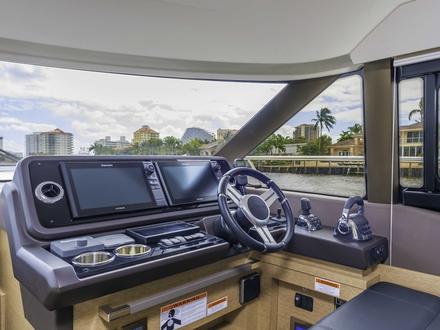 Les Prestige Sportyacht représentent un mixte ingénieux entre le toit vitré ouvrant et le Sportfly qui permet de profiter pleinement de l’extérieur. Deux nouveaux modèles sont présentés la 630 S et la 680 S. Sur le plan motorisation, la 630 S est équipée d’une motorisation Volvo IPS 950 ce qui lui confère une grande manœuvrabilité, une autonomie importante et une parfaite insonorisation. A l’intérieur, les larges vitrages et la présence du toit vitré permettent d’obtenir une luminosité maximum et une vue sur la mer de 360°. On retrouve le même concept sur toute la gamme : un accès indépendant à la cabine propriétaire. La cabine dite VIP est harmonieusement équilibrée avec la cabine propriétaire. Les matériaux sobres et nobles sont les mêmes et la luminosité est importante grâce aux hublots de toit et latéraux. La troisième cabine est modulable avec au choix un lit double convertible en deux lits simples. Le Sportfly quant à lui se compose d’un poste de pilotage complet, d’un salon en U transformable en bain de soleil et d’une cuisine grill. La 680 S reprend le même concept que sur la 630 S avec un volume plus important et est proposée en quatre cabines avec une motorisation en IPS 1200. Sur le Sportfly, l’immense salon arrière en U est dédié à la détente. Sa table peut s’abaisser électriquement pour former un très large bain de soleil. Sur ce modèle, un accès latéral séparé du poste de pilotage prolonge le salon avec une grande porte vitrée coulissante. Ce bateau sera présenté au Yachting Festival de Cannes au mois de septembre en version cabine ambiance chêne grisé.
