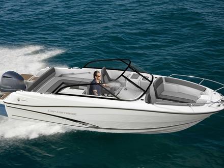 Coté Cap Camara, il y a deux nouveaux modèles : le 7.5 BR (Bow Rider) et le 9 WA (Walk Around). Le 7.5 BR est un bateau au look contemporain qui se caractérise par une silhouette sportive tout en gardant un côté sécurisant. De plus, point important, il bénéficie du gabarit européen transportable. Une répartition astucieuse des espaces de vie qui présentent la même surface à l’avant qu’à l’arrière, est idéal pour les familles car cela laisse une zone dédiée aux enfants. Pour la sécurité, un large passage central permet d’accéder directement du cockpit avant au cockpit arrière. Ce dernier est étudié pour faciliter la vie à bord avec à tribord la console de pilotage et, dans son prolongement, une cuisine extérieure. Du côté bâbord, la console a un accès direct aux toilettes. Pour la convivialité, il y a un grand bain de soleil à l’avant ainsi que des plateformes arrière « flush » bien agréables pour la baignade et qui ajoutent un look sportif à son ergonomie. La possibilité de mettre une table de cockpit aussi bien à l’avant qu’à l’arrière est un plus certain. Sur cette unité, qui se veut multiprogrammes, tour de wake et équipements adaptés à la pêche complètent le concept de ce Bow Rider.
