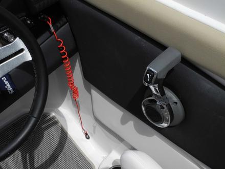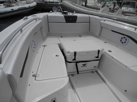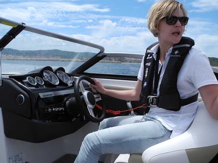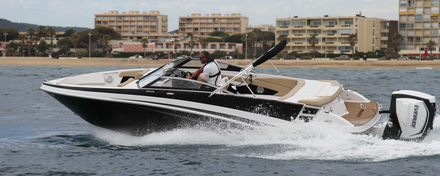 Nos essais se sont déroulés au Lavandou au mois de juin, les conditions de mer étaient assez variables avec du clapot et un vent entre 10 et 15 nœuds. Le modèle dont nous disposions était équipé d’un moteur Evinrude 300 CV, la puissance conseillée et maximum qu’il peut recevoir. Tout d’abord, on ne peut qu’apprécier la position de conduite qui permet de bien la régler en fonction du pilote. Ensuite, le moteur qui réagit vite ce qui permet de déjauger en moins de 5 secondes et d’atteindre rapidement 22 nœuds. Sur cette mer clapoteuse, nous avons rapidement atteint les 40 nœuds mais là on doit pousser le moteur à 5000 t/mn. La bonne vitesse de croisière pour le confort sur une mer calme ou peu clapoteuse se situe autour de 25 nœuds (moteur 3500 t/mn). A bord, nous étions quatre personnes et le confort à vitesse constante s’est avéré tout à fait satisfaisant. Bien entendu, pour qu’il le reste, il faut être vigilant à la conduite et éviter les virages trop serrés lorsqu’il y a des vagues au risque de mouiller les passagers.
