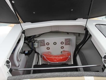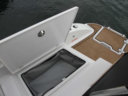Tout est prévu à l’avant pour le confort des passagers. On y trouve des banquettes en U à haut dossiers avec à portée de mains des porte-gobelets, des mains courantes et des vides poches. L’heure de la sieste étant venue, elles se transforment en solarium. Côté rangement, il y a des coffres sous les assises (cockpit et avant) et dans le passage vers l’avant. Celui-ci est suffisamment long pour y loger du matériel de sport. Mais du fait de la motorisation hors-bord, le traditionnel compartiment moteur devient un grand espace de rangement, par exemple, pour les pare-battages. Reste la cabine, par laquelle on accède par une petite porte côté bâbord. Il est vrai qu’elle est petite, mais elle a toutefois un lavabo et, en option, des toilettes peuvent être installées. La plage arrière (plage de bain) de bonnes dimensions (2.00 x 60 cm) est équipée d’une douchette, d’une échelle de bain repliable masquée par un capot mais c’est aussi là que se situent les nables de remplissage eau et carburant.