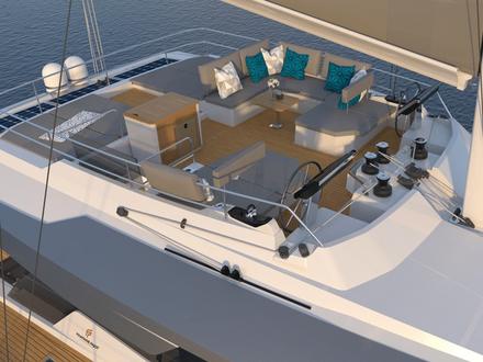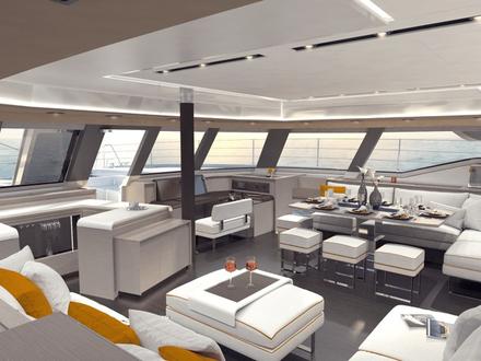 De fait, trois versions seront au programme. La version « propriétaire » dite « maestro » offrira une suite dans l'une des deux coques et un accès direct au pont avant. La version « lounge » avec la cuisine dessinée en coursive devrait dédier totalement le carré à la réception et à la détente. Enfin, une version « charter » à est au programme avec six cabines, toutes identiques, plusieurs salles de bain et un espace réservé à l’équipage. Côté finition et style, le constructeur tricolore annonçe « un style intérieur très tendance, plus arrondi et plus asymétrique… ». Le nom de baptême du nouveau catamaran « flagship », de même que les tarifs, devraient être communiqués courant 2018.