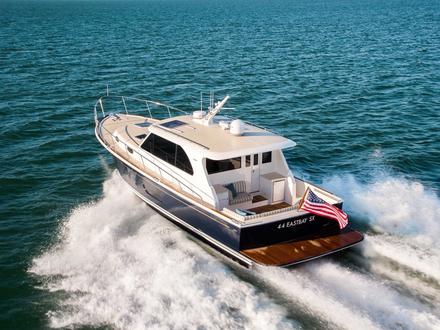Sa coque modifiée au V profond permet un bon passage dans la vague, une poupe avant-gardiste à surface planante et des bouchains larges inversés offrent un confort et une bonne stabilité lors des manoeuvres. Pour Mark Richards, PDG de Grand Banks, « le nouvel Eastbay offre tout le confort et le style que vous appréciez dans un yacht de style Downeast mais avec des vitesses de croisière pour pousser vos aventures plus vite et plus loin. Cette toute dernière génération est aussi plus légère et plus efficace » conclut-il. A bord du motor-yacht, on retrouve deux moteurs diesel Volvo Penta IPS 600 (soit 435 chevaux chacun) lui permettant d’atteindre environ 20 noeuds en vitesse de croisière et 32 noeuds en pointe. Plutôt rapide pour un Grand Banks !