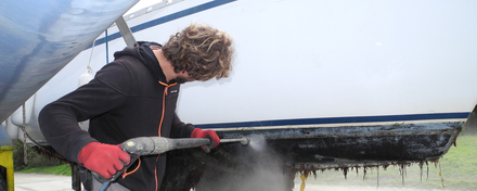 Si vous envisagez un traitement osmose curatif, la carène doit être remise à nu. Là, pas d’alternative, il faut tout ôter y compris le gelcoat, afin que la fibre puisse sécher. Pour le faire plusieurs solutions existent telles que le brûlage, le sablage ou plus généralement le rabotage. Pour simplement enlever les couches d’antifouling, deux solutions permettent un nettoyage efficace : l’hydrogommage et l’aérogommage.
