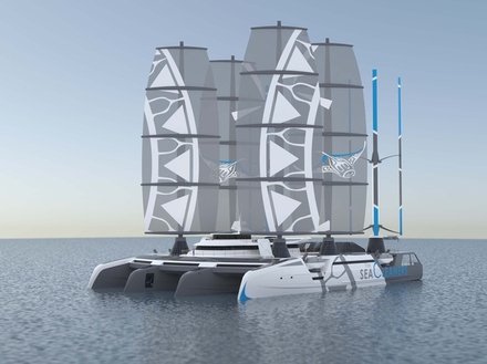 Au-delà de sa mission de nettoyage des océans, le Manta est en lui-même un pari technologique sans précédent. La propulsion et l’autonomie énergétique du navire sont deux enjeux fondamentaux du projet. C’est dans une optique d’innovation toujours plus poussée que le Manta sera alimenté par plusieurs sources d’énergie renouvelable. Il sera propulsé par quatre gréements DynaRig et quatre moteurs électriques. Pour les alimenter, il embarquera plusieurs technologies combinées de production d’énergie renouvelable associées à un système de stockage énergétique optimisé. 2000 m2 de panneaux solaires vont ainsi être installés sur le pont du quadrimaran et deux éoliennes verticales utiliseront la force du vent pour produire de l’électricité. De quoi permettre au Manta d’être autonome dans ses phases de déplacement et de collecte et de pouvoir se déplacer sur toutes les zones de forte densité de pollution (estuaires, zones côtières…).