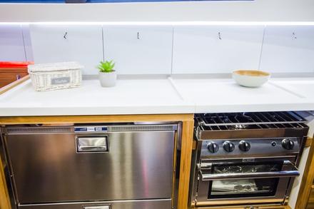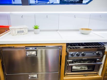 L’ergonomie est très bonne, une ou deux cabines peuvent occuper l’arrière. La cuisine en coursive est très spacieuse et la gazinière à deux positions, fixe pour le quai et pendulaire en navigation complète, un plan de travail en Corian et des tiroirs réfrigérants. Les magnifiques peausseries des banquettes voient leur accueil quelque peu terni par une assise inconfortable due à une mauvaise ergonomie des assises et dossiers qui méritent d’être retravaillés.