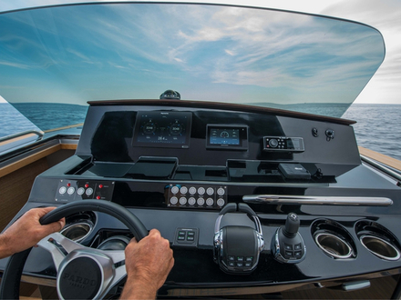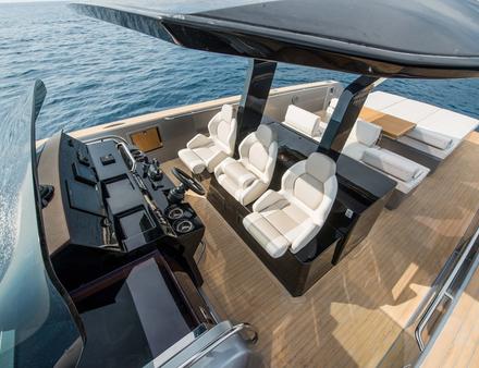 Le chantier italien se singularise par un design très épuré, les aérations moteur sont dissimulées à l’intérieur des hiloires. Le système de mouillage intégré dans l’étrave, le pare-brise sans montants et les arceaux du T top profilés en carbone, ne trompent pas sur les origines transalpines.