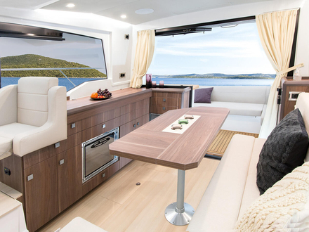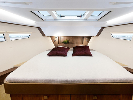 Des grands hublots à l'avant de la coque viennent éclairer les différents espaces et offrent une vision panoramique sur l'horizon. Le toit ouvrant est un véritable plus pour aérer et profiter du soleil. Par mauvais temps, la navigation n'est pas impactée, grâce au grand pare-brise avant.