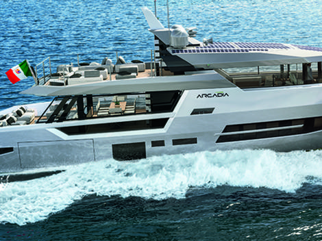 Les pavois situés le long de tout le cockpit sont munis d’ouvertures design permettant en outre aux invités, assis sur les divans ou à table (celle-ci pouvant accueillir de 8 à 10 convives dans la version optimale) de profiter pleinement du panorama. Le trait d’union entre l’extérieur et l’intérieur, qui met l’accent sur la relation avec la mer et l’environnement autour, est sans aucun doute représenté également par le skylounge (de 34 m2), où grâce aux baies vitrées toutes coulissantes de haut en bas, il suffit d’appuyer sur un bouton pour profiter directement de la brise marine.