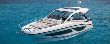 Retravaillé et doté d’un très grand vitrage, son lumineux hard top garantit une vision optimale en navigation. À l’avant, un semi walk around permet une circulation en sécurité pour rejoindre les bains de soleil. Au poste de pilotage, deux sièges bolster côté console sont complétés à bâbord d’une banquette double, et peuvent accueillir jusqu'à 4 personnes. Côté cockpit, la configuration pleine largeur Gran Turismo 32 maximise l’espace. En un clin d’oeil, méridienne et banquette arrière basculante forment un vaste solarium. Côté aménagement intérieur, on trouve une cuisine équipée à tribord, deux double-couchages et une salle d’eau avec douche séparée des toilettes.