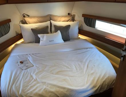 A l'intérieur du Rhéa, le style se veut sobre et classique avec beaucoup de boiseries et des tons clairs. La porte vitrée du salon principal ainsi que la vitre de cuisine s'ouvrent complètement pour donner beaucoup d'espace et de convivialité lors des repas. Le Trawler 34 est prévu avec deux cabines dont celle du propriétaire placée à l'avant dans l'étrave tulipée du bateau incluant un lit double. La hauteur sous barrots est bonne, reste juste à prévoir un peu de décoration pour l'embellir. Enfin, une cabine sur tribord est au programme pour les invités. Elle peut s'intégrer à la cabine avant par un système de cloison escamotable.