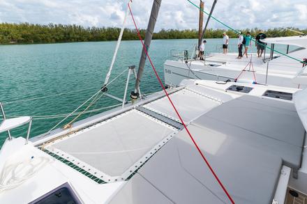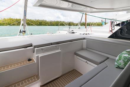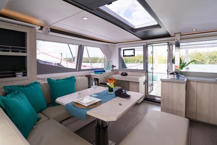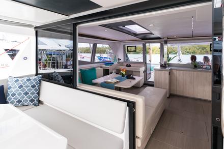 A peine monté à bord, l'évolution est évidente : le retour de la banquette tribord à l'arrière du poste de barre a été supprimé. Résultat : le carré paraît bien plus vaste. La nouvelle couleur gris clair des tissus et du mobilier contraste parfaitement avec le blanc du catamaran et le teck (une évolution en option cependant). Le siège du poste de barre a également évolué pour offrir encore plus de confort au capitaine. Une commande digitale avec écran tactile a été installée.