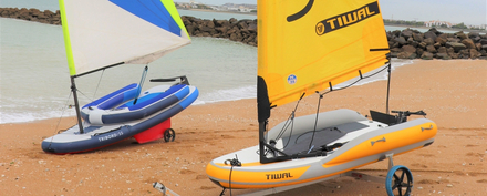 A ses côtés, le Tiwal 2 reprend les codes couleur de son aîné dont on retrouve la filiation par moults détails : carène en V, pied de mât et puit de dérive en alu, voile North et accastillage Harken rassureront les navigateurs les plus expérimentés. Mais il ne fait pas seulement 40 cm de moins que le Tiwal 3 sorti en 2012. Il remplace les échelles de rappel tubulaires par des ailes gonflables, en faisant le « toy » idéal au mouillage. Surtout que sa voile s’enroule autour du mât pour les pauses entre deux bords. Suivant les dernières tendances architecturales, l’étrave a pris du volume et de la hauteur, reculant très nettement le risque d’enfournement. Si du fait de sa dérive sabre et de son safran allongé relevable, départ et arrivée se font un peu plus loin de la grève, une fois en route le Tiwal 2 est une petite bombinette très facile à prendre en main et qui régalera aussi bien débutants que régatiers aguerris. On soigne les angles de remontée au vent, on tente de battre des records de vitesse au portant, et ne soyez pas surpris si vous vous inquiétez très vite de savoir quand se déroule la prochaine Tiwal Cup, rendez-vous annuel de la communauté mondiale Tiwal.