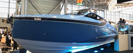 Dans le sillage du F//Line 33, présenté en septembre dernier à Cannes, Fairline exposait à Düsseldorf une toute nouvelle version hors-bord, conçue également par le designer italien Alberto Mancini. D'allure moderne mais une touche "vintage", ce dayboat affiche une étrave droite et une plate-forme arrière de bain intégrant deux puissants moteurs. Celle-ci s'abaisse et s'immerge au mouillage. Le nouveau Fairline est disponible avec deux moteurs hors-bord essence Mercury Verado 300 ch pour une vitesse maximale estimée à 37 nœuds ou avec deux moteurs Mercury Verado 350 ch, offrant près de 42 nœuds en pointe. Pour les plus sportifs, le bateau à moteur peut-être motorisé également avec deux Mercury Verado 400 soit 45 nœuds en pointe.