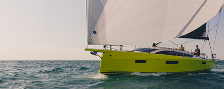 Le positionnement des quatre winches autour de la descente, permet une très bonne ergonomie, mais limite le nombre d’équipiers pouvant œuvrer simultanément. Accéder à la plage avant est facilité par les cadènes de bas-haubans rentrées, et le volume d’étrave important tend à faire disparaître le mot « enfournement » du vocabulaire marin. Proche du vent, on sent tout le bénéfice de la carène qui donne raideur et stabilité au bateau. Au portant, c’est une luge jaune qui dévale les vagues avec des vitesses à deux chiffres. Rentrer au port par trente nœuds de vent, même sans propulseur mais avec hélice MaxProp (option), est un jeu d’enfant, le bateau virant dans un tout petit périmètre.