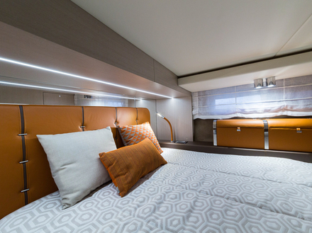 A bord, Invictus propose toujours des options de personnalisation et d'aménagement à l'image de la version sterndrive du GT370. C'est le point fort de cette marque face à la concurrence. Sous le pont, deux espaces spacieux peuvent être configurés. La grande cabine arrière dispose de deux couchages qui peuvent être transformés en un lit assez grand pour accueillir très confortablement trois enfants ou deux adultes. La cabine avant peut être équipée d'un troisième lit ou d'un grand canapé latéral avec une petite table, un meuble bar et une télévision. Bien entendu, une salle d'eau décorée avec inspiration est au programme.