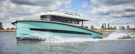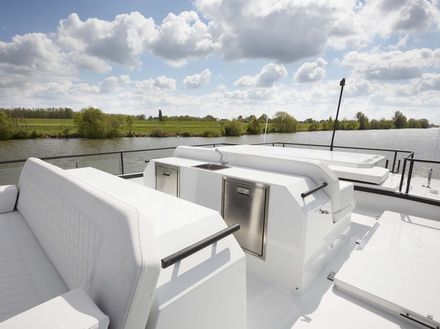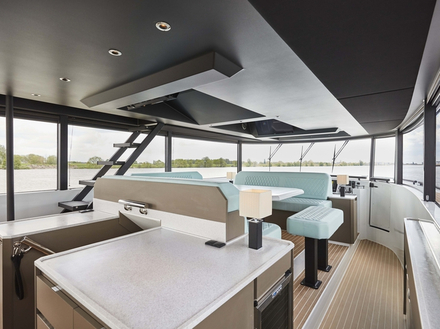 Avec ses lignes épurées et son aspect robuste, l'esquif affiche un look de baroudeur. Un esprit qui se confirme dans le choix des matériaux. Du pont en composite (qui remplace le teck nécessitant beaucoup d’entretien) aux très grands casiers de rangement facilement accessibles. Le flybridge dispose d’une grande table à manger avec des sièges qui se transforment en un grand espace de bronzage à l’arrière. Le poste de pilotage est équipé d’un minibar avec évier et d’un siège à deux places. Le pont principal dispose d’une autre table à manger, d’un minibar avec évier, d’un poste de navigation avec siège à deux places et de grands coussins de bronzage sur le pont avant pour se détendre au mouillage ou profiter d’une superbe vue lors de la navigation. Au total, il peut accueillir jusqu’à 36 invités à bord !