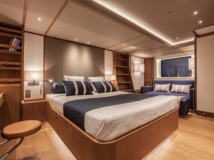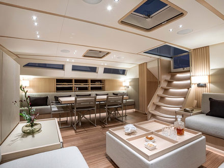 Quant à l'aménagement intérieur, il est typique en standard avec une cabine propriétaire à l'avant et quatre cabines invités avec salle de bain, et un espace dédié pour l'équipage. L'une des innovations les plus remarquables de l'intérieur est le grand escalier transparent qui mène du cockpit au salon, avec deux autres des escaliers descendant au niveau des logements à l'arrière, créant ainsi une entrée spectaculaire. "Travailler sur ce projet a été très inspirant pour nous, nous pensons que ce sera un classique et un best-seller de l'histoire du Swan", conclut Vanni Galgani, responsable de la ligne de produits.