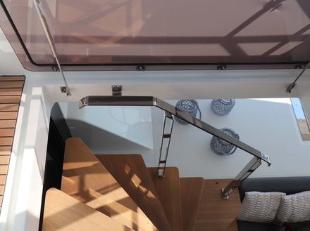 Au niveau supérieur, le flybridge, qui accueille le poste de barre principal et la quasi-intégralité de toutes les manœuvres, est exposé au vent apparent en navigation. Pourtant, depuis la barre à roue centrale l’impression de tout pouvoir contrôler est prégnante. La vue est, directe sur les étraves, via les caméras sur les jupes via l’écran géant Garmin, immédiate en levant la tête vers les voiles. Les winches sont à portée de main, voir au bout des doigts quand ils sont électrifiés comme ici. Les 30m² « habitables », deviendront vite le lieu de vie privilégié au mouillage entre grands bains de soleil arrière, carré et cuisine d’extérieur au centre, à l’ombre du bimini rigide, plus indispensable qu’esthétique.